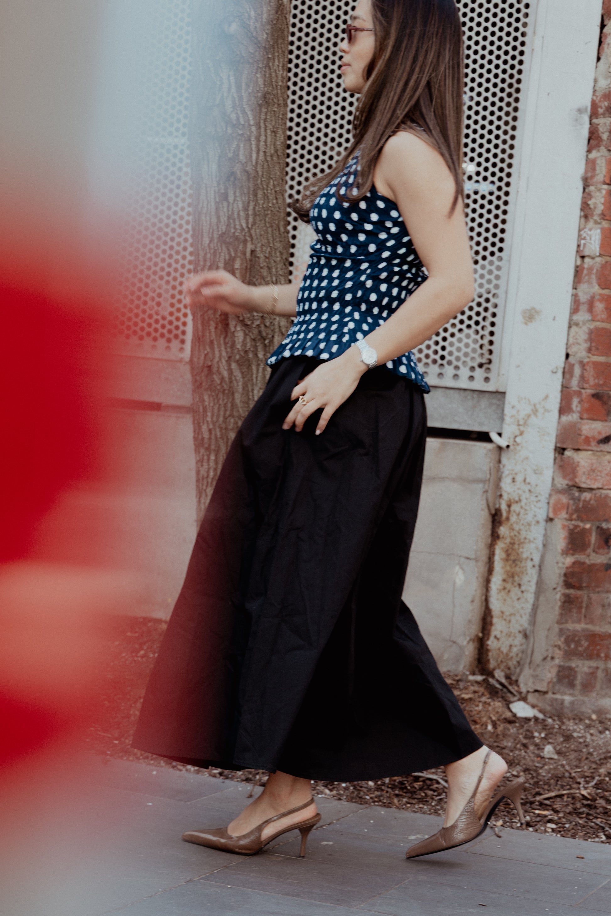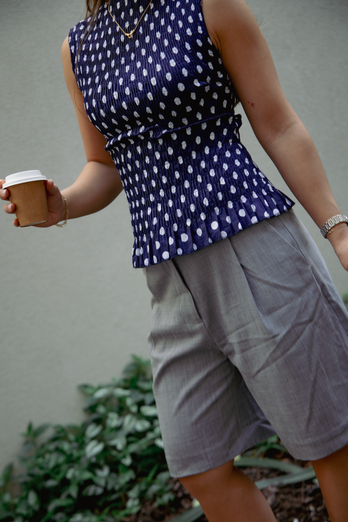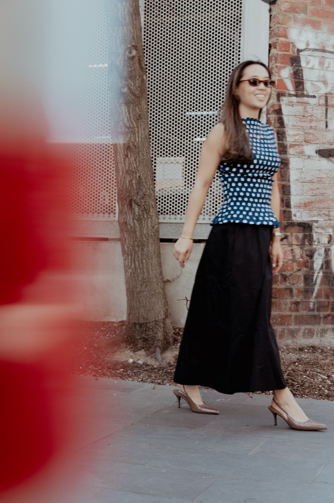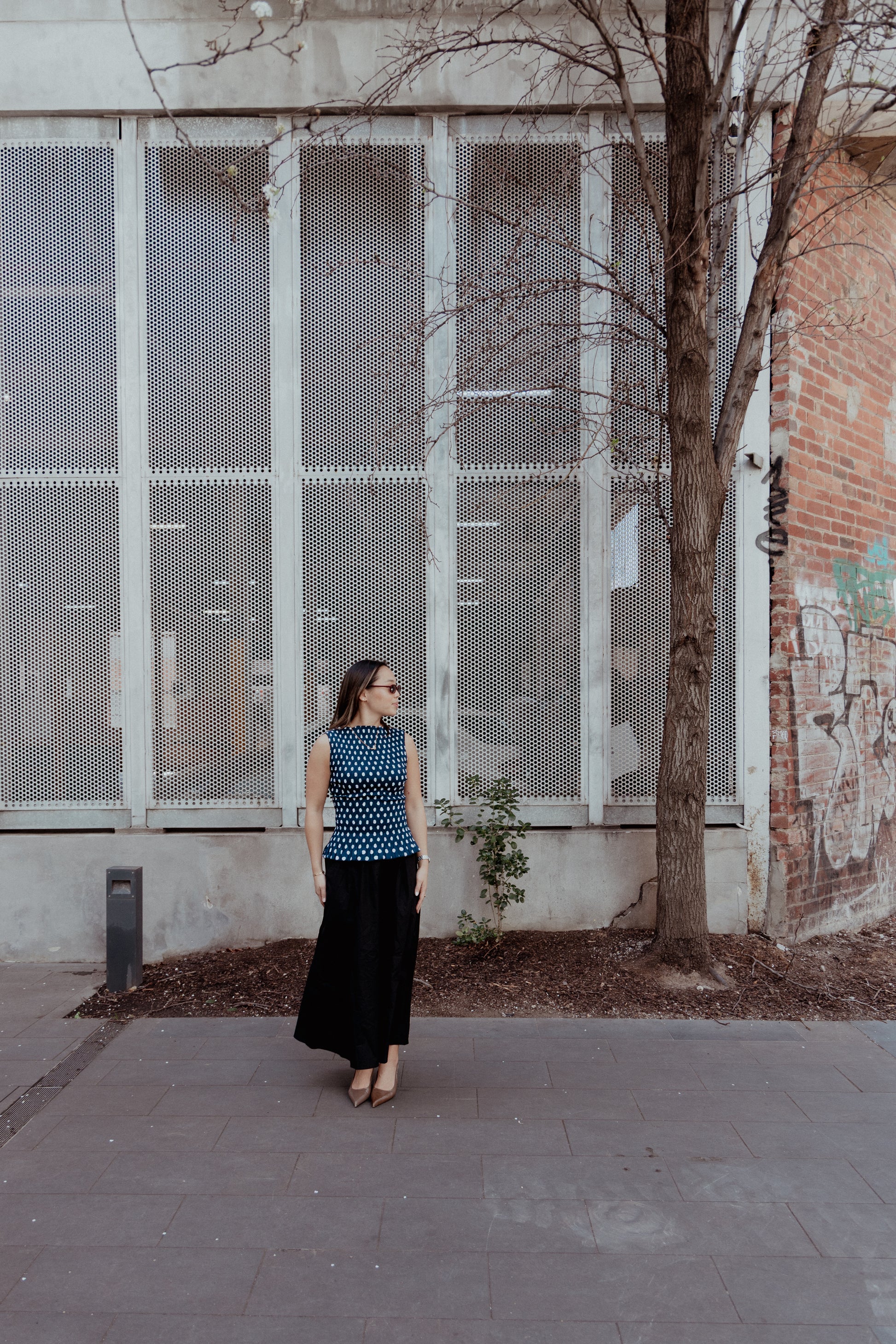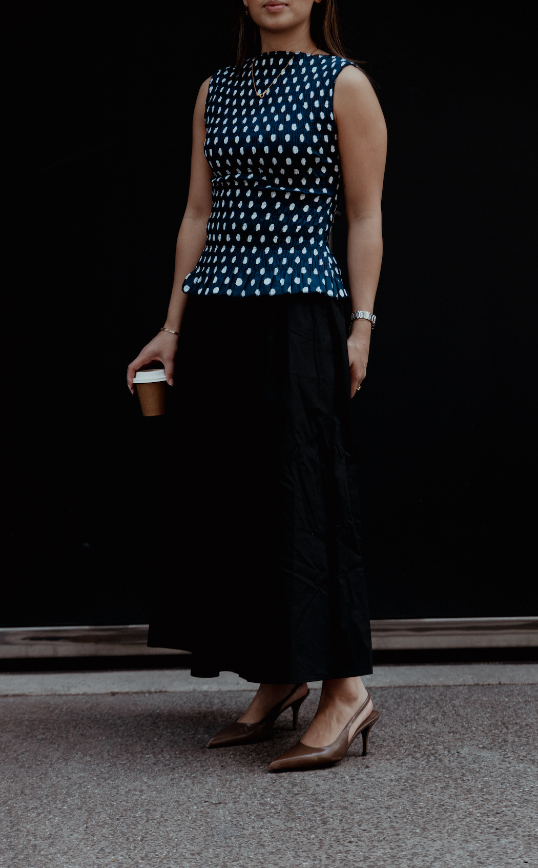 The Luna Tank – Navy is a refined take on a classic print. The deep navy base and white polka dots feel timeless yet fresh, while the soft shirring through the bodice creates a naturally flattering fit. Made from 100% cotton, it’s structured but comfortable, easy to wear from work to the weekend. Pair it with tailored pants for the office or linen for an off-duty look
