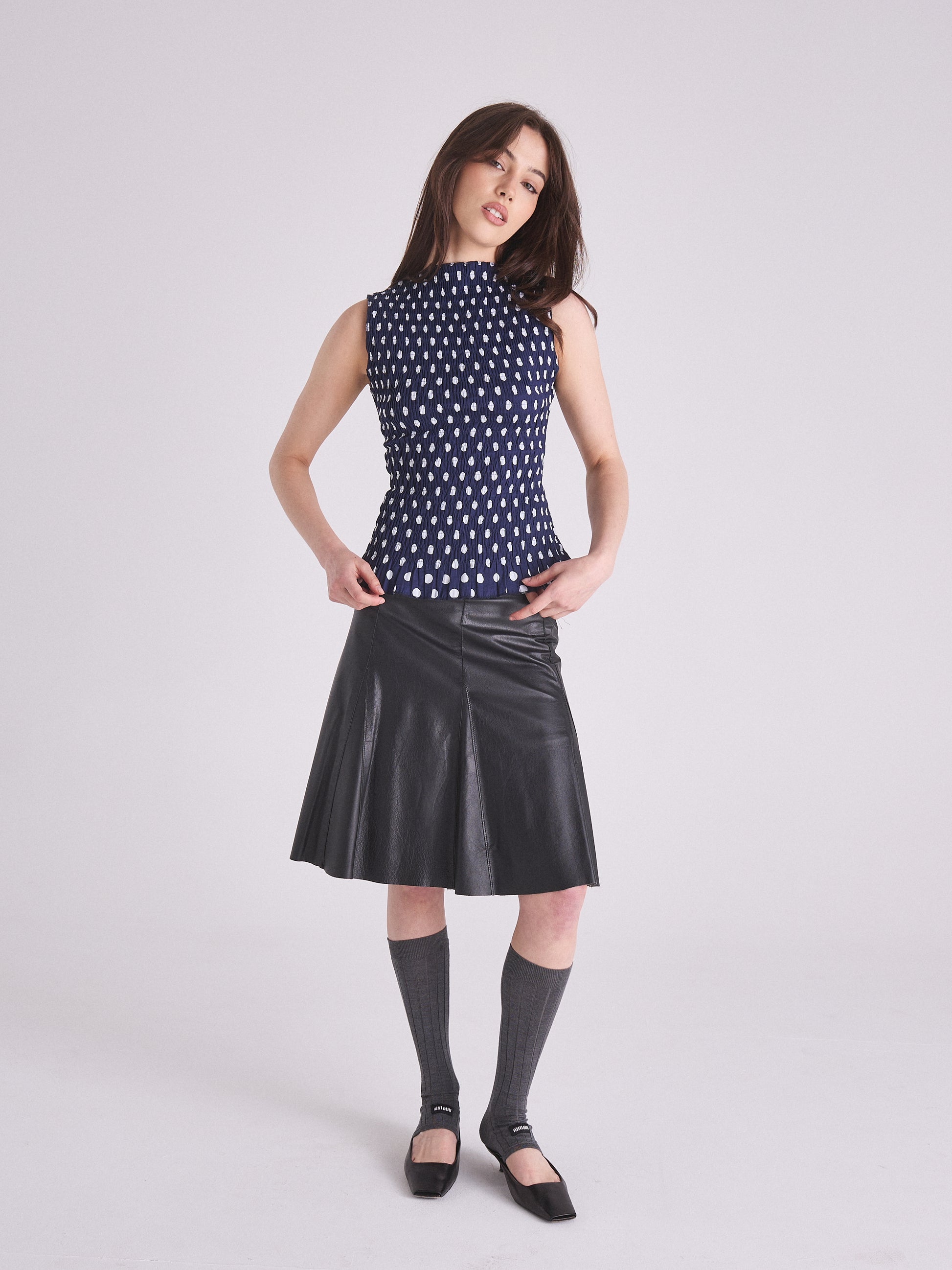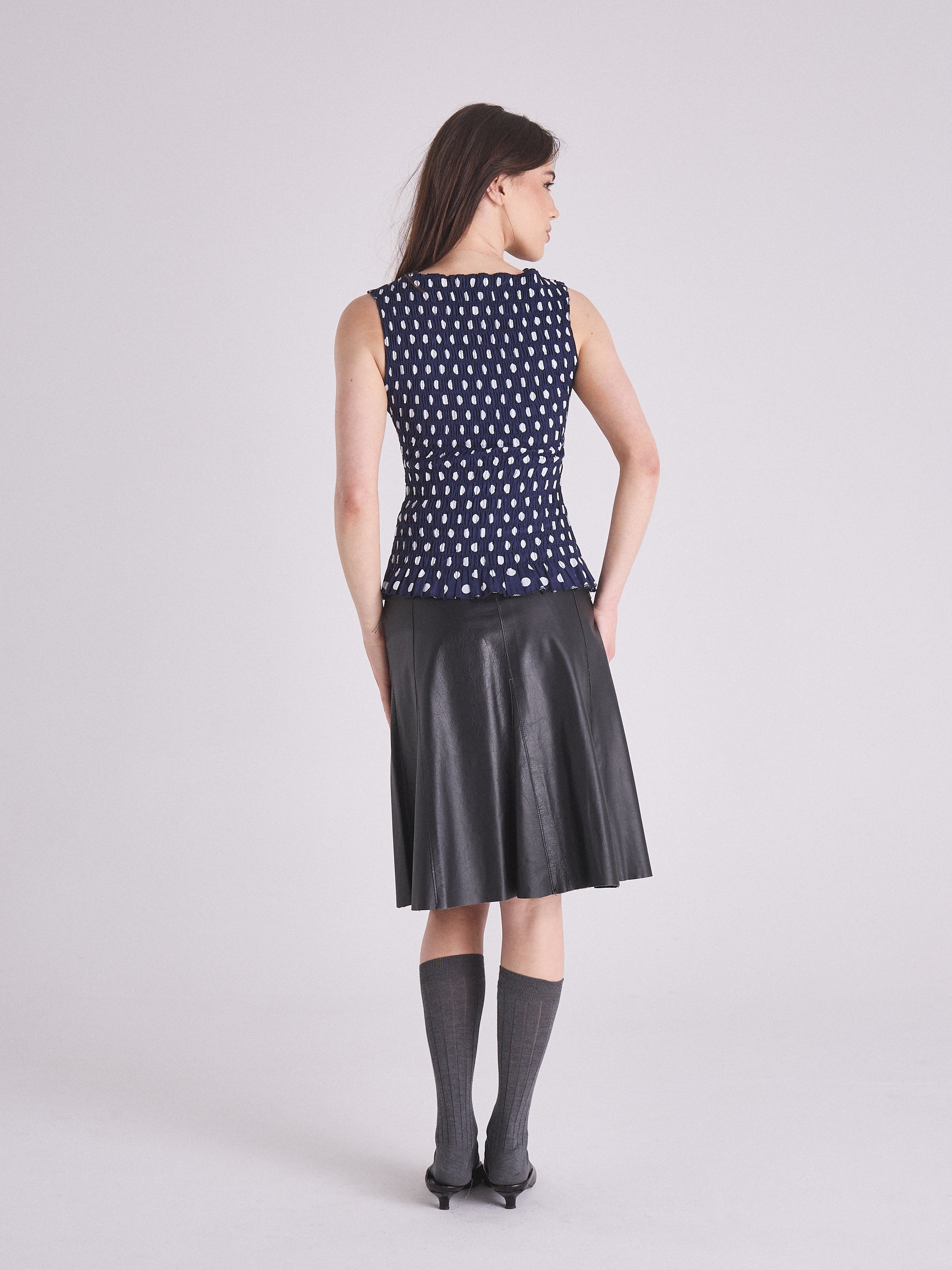 The Luna Tank – Navy is a take on a classic print. The deep navy base and white polka dots feel timeless yet fresh, with soft shirring through the bodice creates a naturally flattering fit. Made from 100% cotton, it’s structured but comfortable, easy to wear from work to the weekend! For a more fitted feel, we recommend sizing down.