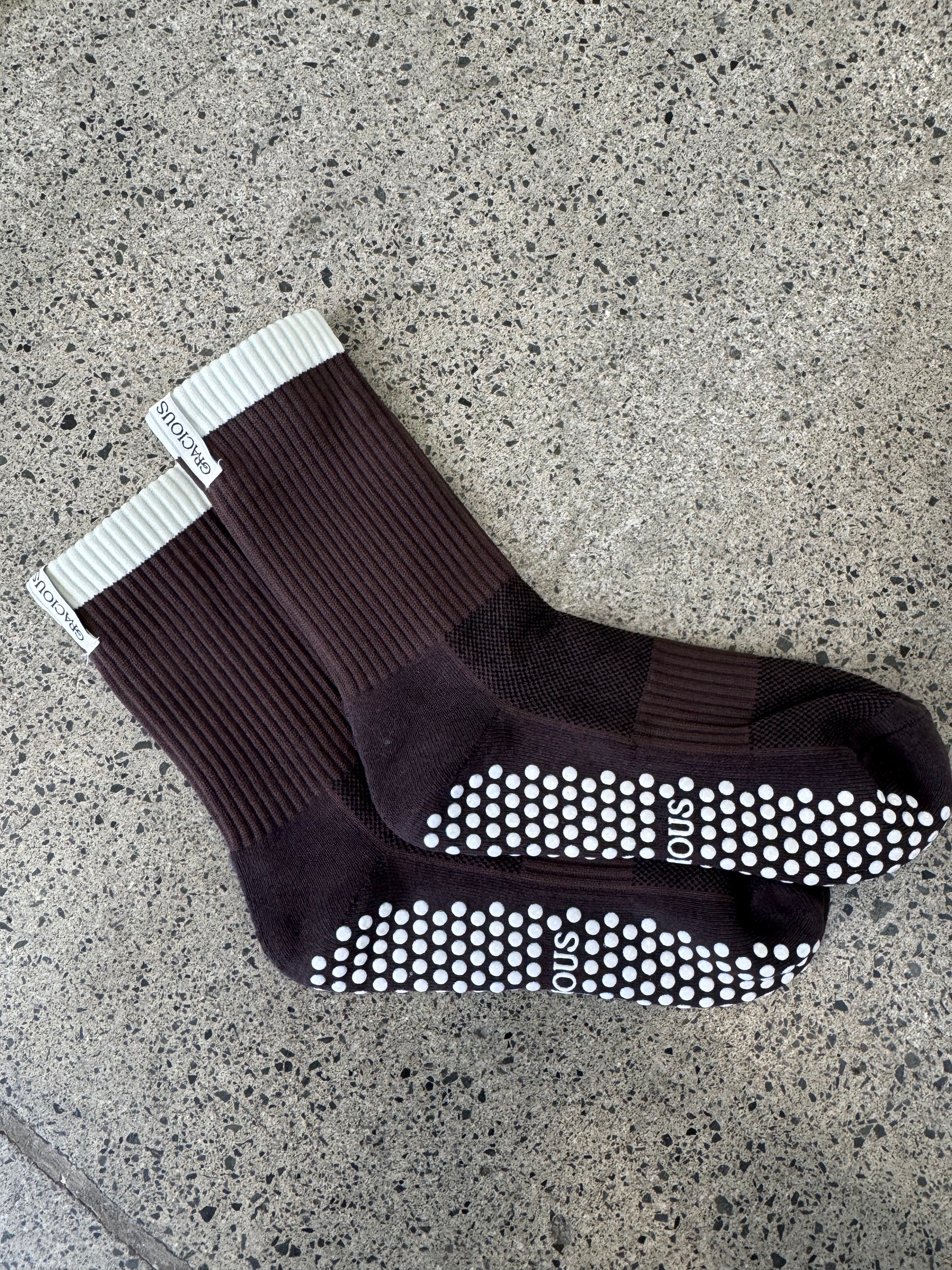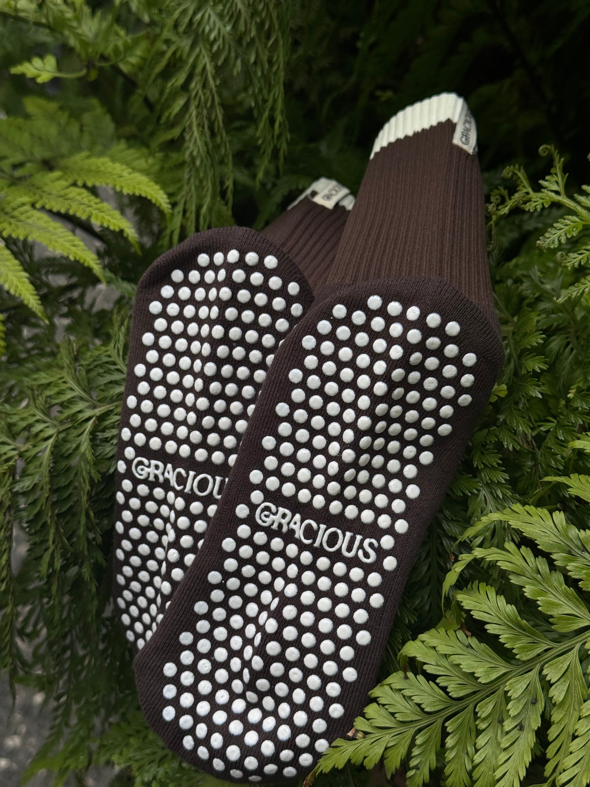 From Pilates to work (and everything in between). Our Gracious Grip Socks are designed for movement, comfort, and style. The espresso and cream design mirrors our Luna Tank – Espresso, pairing soft mesh detail with a sculpted fit that stays in place. A full-sole silicone grip keeps you grounded through every reformer class, while the breathable fabric makes them just as easy to wear on the go